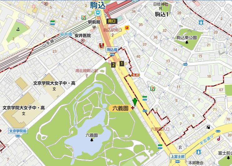 JR山手線・東京メトロ南北線駒込駅南口を出て、本郷通りを六義園方面を約5分。